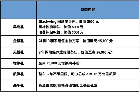 目前预售方案已出,即日起至3月1日16:00前订购,并于4月30日前提车的用户,可享至高7.8万元预售礼,其中包括价值5000元Blackwing同款车身色,价值5000元黑标性能套件,价值3000元油费补贴权益,24期0利率金融方案,3年保险保养维修服务包,至高2.5万元增换购补贴,整车3年不限里程、动力总成8年16万公里质保,赛道性能版/巅峰赛道选装包礼盒。