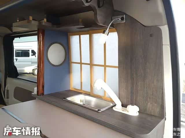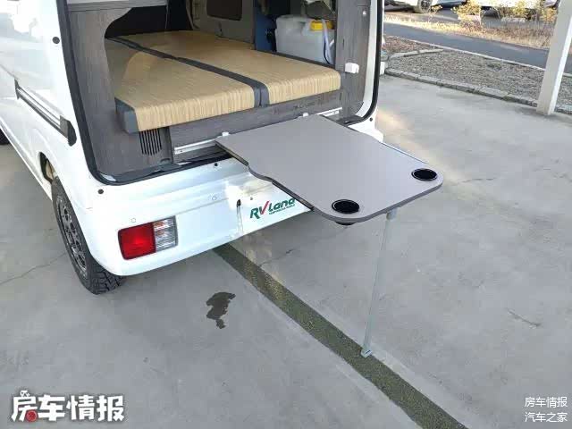 一侧上方还提供了洗菜池,搭配下方的20升清水箱,再自备一台卡式炉,就可以在车内简单洗菜做饭了,如果觉得这样不是很方便,车尾部还设有一个卡槽,可以把餐桌放置在车尾部,加上一个车尾帐就能变成一个独立小空间。