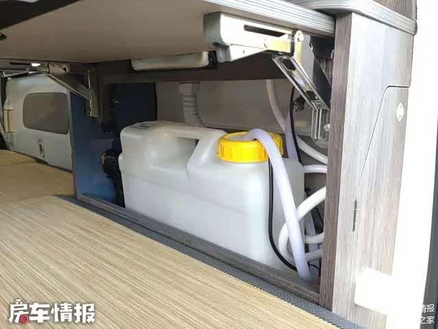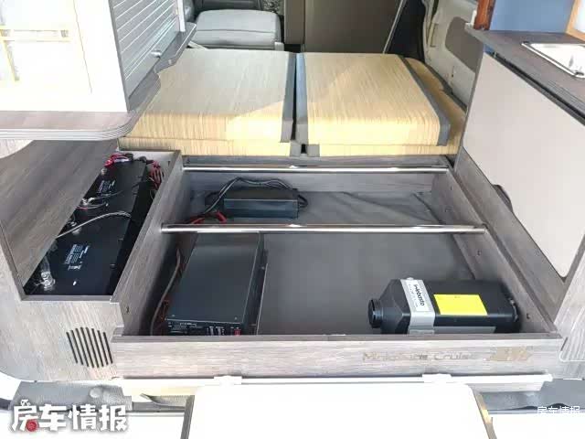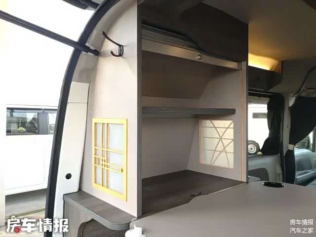 车厢后部则是车内的功能区,这里提供了储物柜,不仅可以收纳旅行中的行李物品,同时也可以收纳拼床用的床垫,空间利用挺好。
