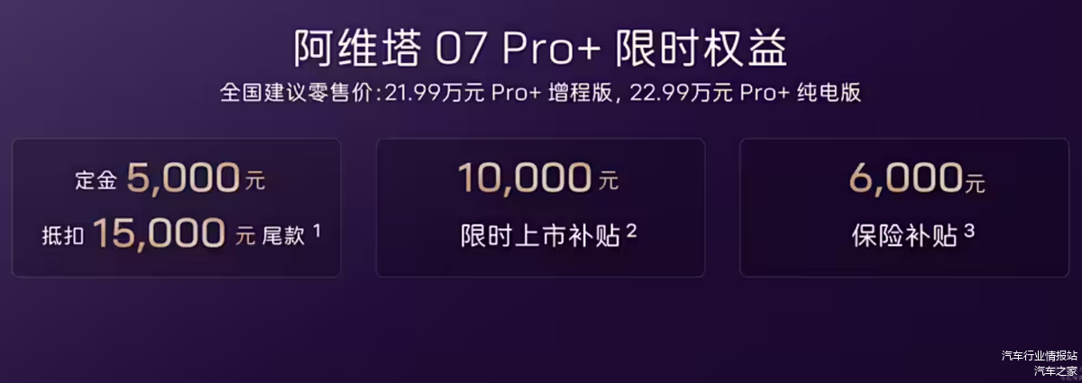 各位老司机们,大家好!请点击关注【汽车行业情报站】,第一时间了解最新的汽车资讯,在这里轻松读懂汽车!近日,情报君从相关渠道获悉,阿维塔科技旗下的全新车型—— 阿维塔07(图片 | 参数 | 询价)Pro+已经正式上市,售价区间为21.99-22.99万元。这款新车不仅继承了阿维塔品牌的科技基因,更是在智能驾驶和智能座舱方面得到了华为技术的全面加持,将对标同级别的热门车型极氪7X,为消费者带来全新的智能出行体验。