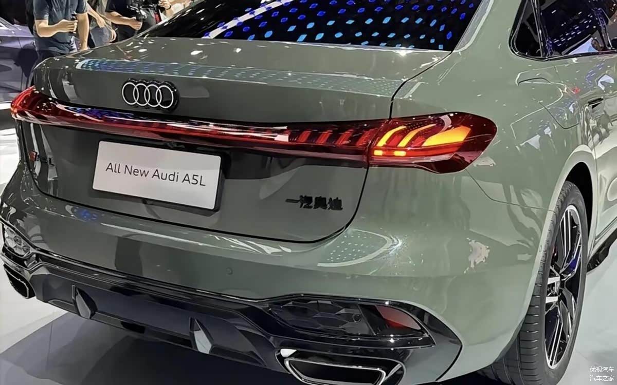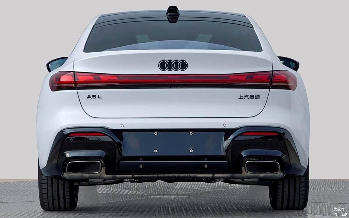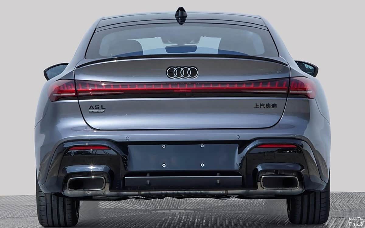 车尾有一个小鸭尾的造型,而尾灯则依旧是采用和一汽奥迪A5L所类似的贯穿式设计,看着并不稀奇,预计点亮后的效果也将不辱奥迪“灯厂”的名声。往下是双边共两出的排气,牌照框位于下保险杠处,整个后包围的造型也点像小米SU7,这点大家注意。