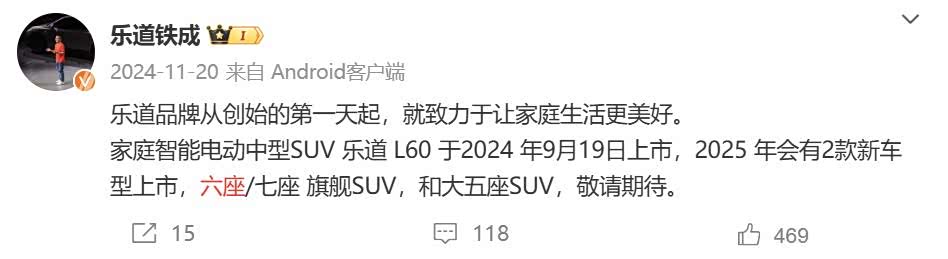 定下如此目标,李斌和艾铁成并非纸上谈兵。艾铁成早前在个人社媒上透露,乐道品牌会在 2025 年推出至少两款新车。