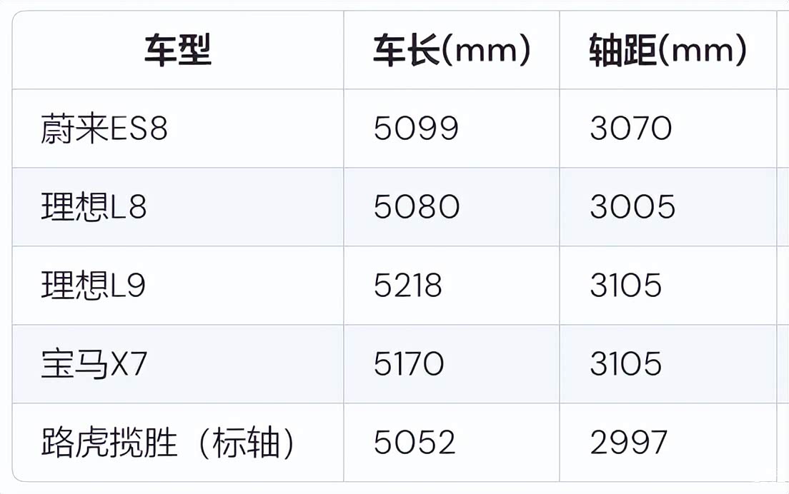 也有爆料指,乐道 L80 的尺寸可以参考理想 L8、L9、宝马 X7 和路虎揽胜。他们的长度与轴距数据如下: