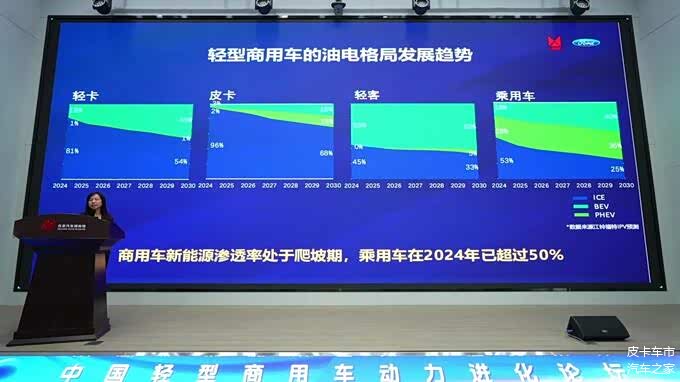 目前,乘用车市场新能源渗透率已经超过了50%,而商用车新能源渗透率还处于快速爬坡期,具体到皮卡车类别中,江铃汽车预测在2030年新能源皮卡的渗透率将会达到32%,燃油型皮卡的份额依旧是占比达到68%。