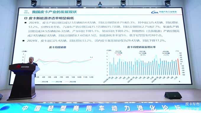 皮卡作为轻型商用车的重要一环,根据中国汽车工业协会统计的数据,在2024年皮卡的产销量分别是52.5万辆和54.8万辆,其中出口的销量是25.4万辆。具体在动力类型上来看,虽然在最近两年中新能源皮卡的渗透率在提升,但是皮卡市场中新能源化占有率不足5%,低于轻型货车约10个点。
