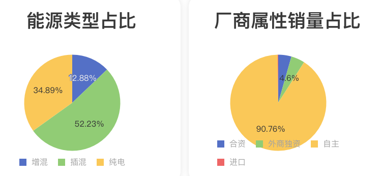 在厂商属性销量占比上,自主品牌在新能源市场占比高达90.76%,在新能源赛道全面领先。