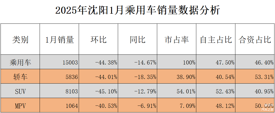 从数据可以看出,SUV仍然是沈阳乘用车市场的主力,但其销量下滑幅度也最大。轿车和MPV市场同样面临较大的下行压力。