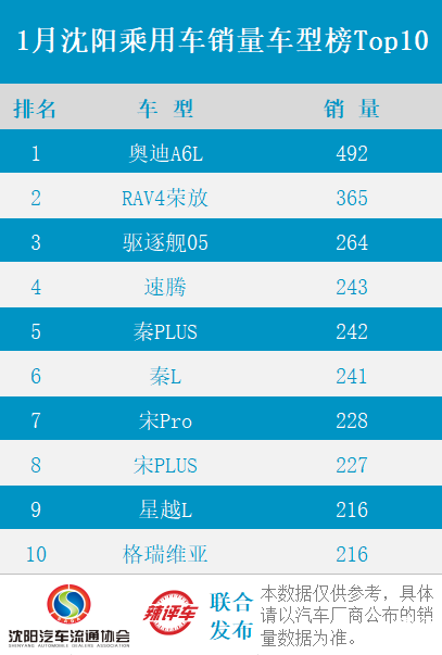 此外,我们还统计了沈阳乘用车市场1月车企品牌及车型销量TOP 10榜单,具体如下: