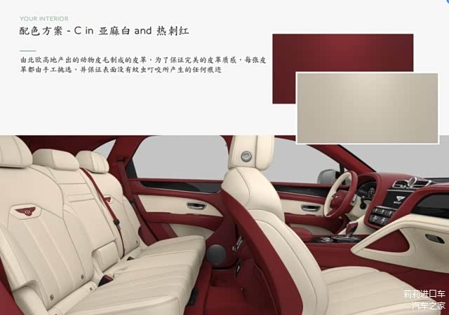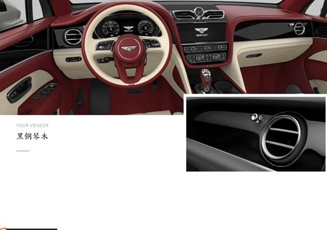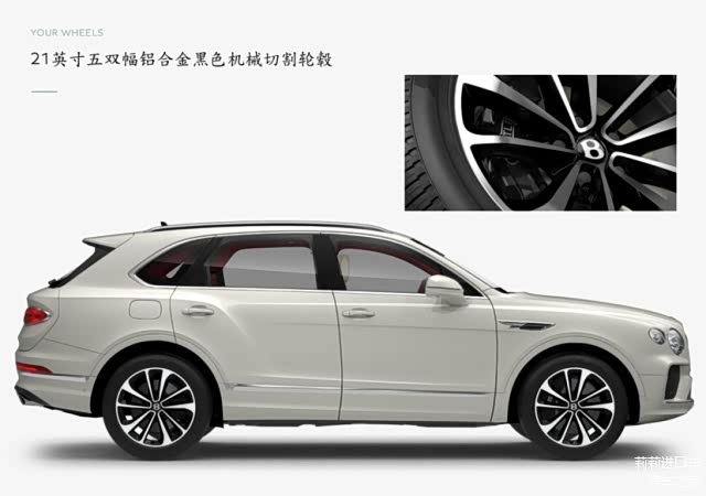 配置:24款 宾利添越(图片 | 参数 | 询价)V8冰川白/亚麻白拼热刺红选配:宾利徽章座椅刺绣前座舒适座椅配置3幅式双色加热真皮镶边方向盘黑钢琴木颜色配置21英寸五双幅铝合金黑色机械切割轮毂。