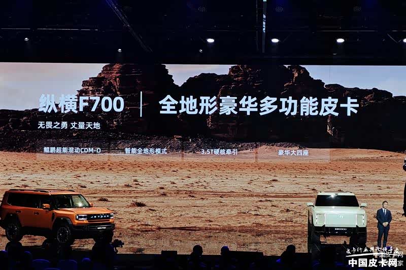 而奇瑞捷途正式发布的“全新豪华电混越野产品序列”捷途纵横中的皮卡产品F700,搭载鲲鹏超能混动CDM-O。这套动力系统预计也与比亚迪DMO类似,2.0TD混动专用发动机匹配2挡DHT混动专用变速箱,组合成前桥的动力总成,后桥拥有2挡P4电机。不过这台车目前还处于概念阶段,距离量产上市预计还有很长时间。