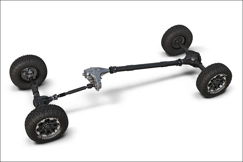 要了解什么是解耦和非解耦四驱,首先你要知道四驱到底是什么意思。在传统的四驱皮卡结构中,动力从发动机-变速箱端输出,经过中央分动箱分为两条路线,一条向后传递到后桥,一条向前传到前桥,这样就形成了四驱结构。这样前后桥的动力是基于同一个动力源发出的,中间有硬连接(也就是向后和向前的传动轴),这样的结构就是非解耦四驱。所以也可以认为,传统的燃油四驱皮卡,基本上都是非解耦四驱结构。