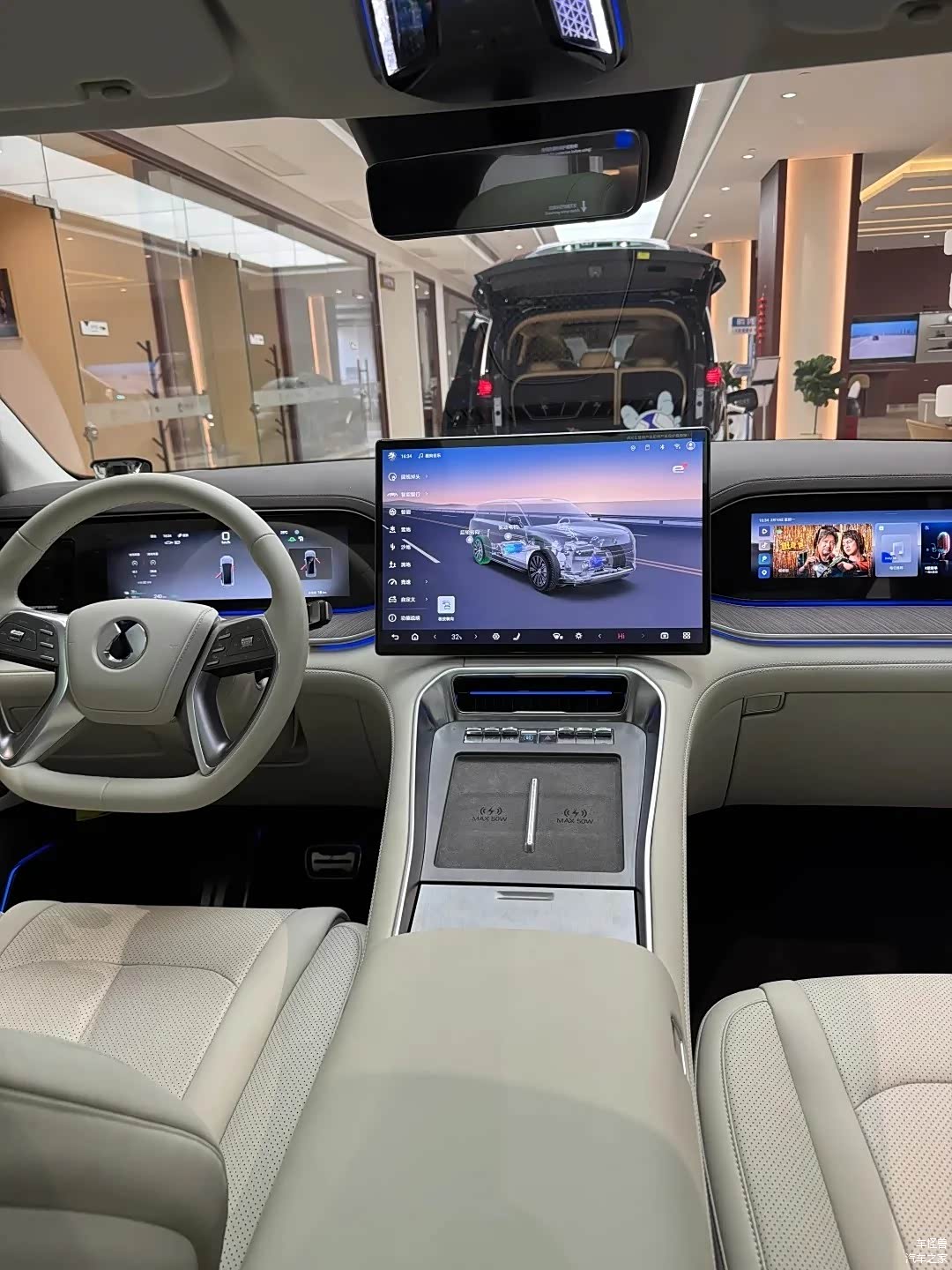 在内饰设计方面,这款新车几乎是继承了腾势Z9 GT的设计理念,给人的第一印象是它既豪华又具有科技。关于多媒体的配置,这款新车的中央控制台配备了三个显示屏,前面有一个大型的HUD抬头显示器,而上方则配有流媒体后视镜。如果你决定安装电子后视镜,那么你还可以额外添加两个显示屏。后排的车顶上方设计了一个尺寸更大的吸顶屏,这使得它能够与前排的娱乐屏幕进行互动,从而一次性创造出一种科技氛围。