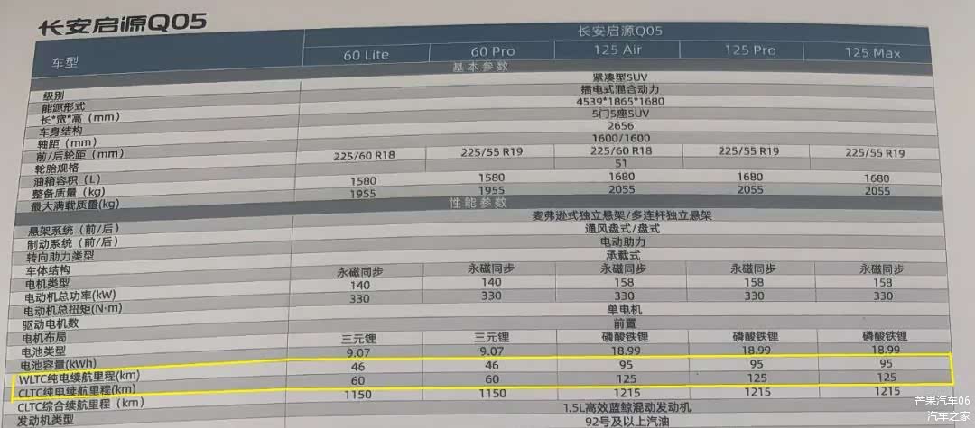 长安启源Q05配置表上同时列出CLTC纯电续航里程和WLTC纯电续航里程