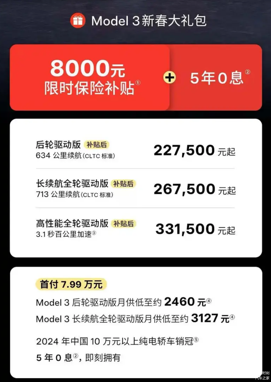每一年的新车优惠大比拼,都少不了特斯拉的参与。作为特斯拉旗下的经典之作,特斯拉Model 3这一次的诚意十足。2月份,除了下订Model 3全系车型可享保险贴息8000元以及1299元的特享充电权益之外,特斯拉Model 3后轮驱动版和长续航全轮驱动版还可以叠加限时5年0息金融方案。