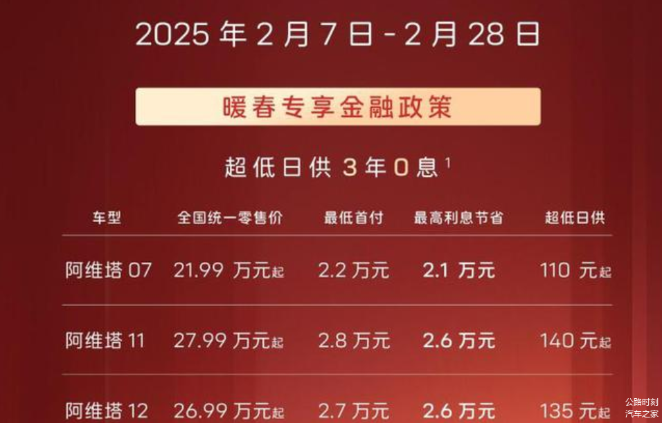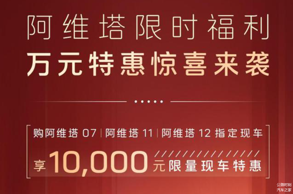 2月份,阿维塔推出了全系车型可享3年0息的金融政策。同时,针对部分车型,还有另外的优惠政策可以叠加。比如购买阿维塔07、阿维塔11、阿维塔12指定现车可以享受1万元限量特惠,活动时间为2月7日-2月28日。其中,阿维塔07限时享价值2万元ADS高阶功能包等额抵扣券,价值6000元保险补贴,价值4000元21英寸轮圈升级,价值1万元Nappa真皮方向盘+Nappa头层真皮座椅+麂皮顶棚。