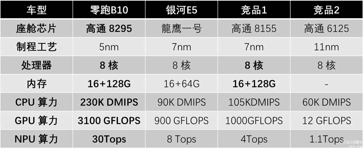下图是零跑B10、银河E5和其他竞品的座舱芯片对比。先看算力,B10搭载了高通8295芯片,采用5nm制程工艺,NPU算力高达30Tops,而银河E5搭载龙鹰一号,7nm制程工艺,NPU算力8Tops,处于行业主流水平。算力上零跑B10具有后发优势,这么强的算力,意味着语音AI算法可以本地化运行,即使没网络,车机也能流畅响应,彻底避免了地下室语音识别犯傻的问题。而且,8295芯片的GPU和CPU性能也超过银河E5,银河E5的车机已经足够丝滑,由此可见零跑B10的车机界面、全景影像渲染都将更上一层楼。