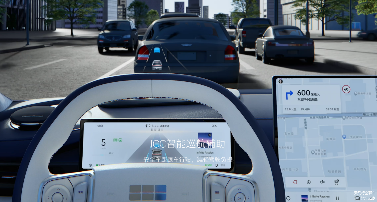 这里银河E5作为一款已经上市一段时间的产品,智驾并没有来得及更新,目前在高配车型上采用的2R6V12U方案,即2颗毫米波雷达,6个车外摄像头,12个超声波雷达,能够支持L2+级别驾驶辅助,具有ICC只能巡航辅助功能,ELKA车道保持辅助和TAA大型车辆避让功能和自动泊车入位,但它是无法支持高快NOA和城区NOA的。