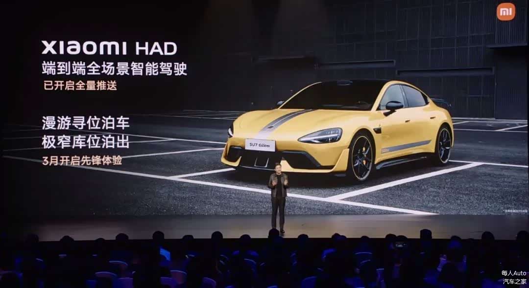 官方信息显示,小米SU7 Ultra全系标配小米HAD端到端全场景智驾,能够实现车位到车位的智能驾驶体验。小米的HAD还在快速迭代:漫游寻位泊车、极窄库位泊出,将在3月启动。所谓漫游寻位泊车,即SU7 Ultra会在停车场内自己寻找空车位并自动泊入。