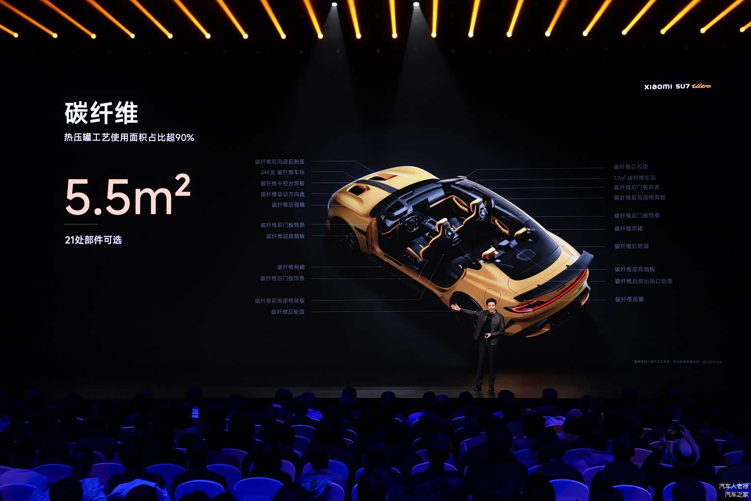小米SU7 Ultra的设计围绕巅峰性能展开,加入空气动力学套件,最大下压力可达 285kg,媲美超跑级车型。全车满配共21处使用碳纤维,总面积达 5.5m²,不仅更富运动感还有效实现轻量化。全系标配 24k金碳纤维车标,黑金搭配,低调奢华。