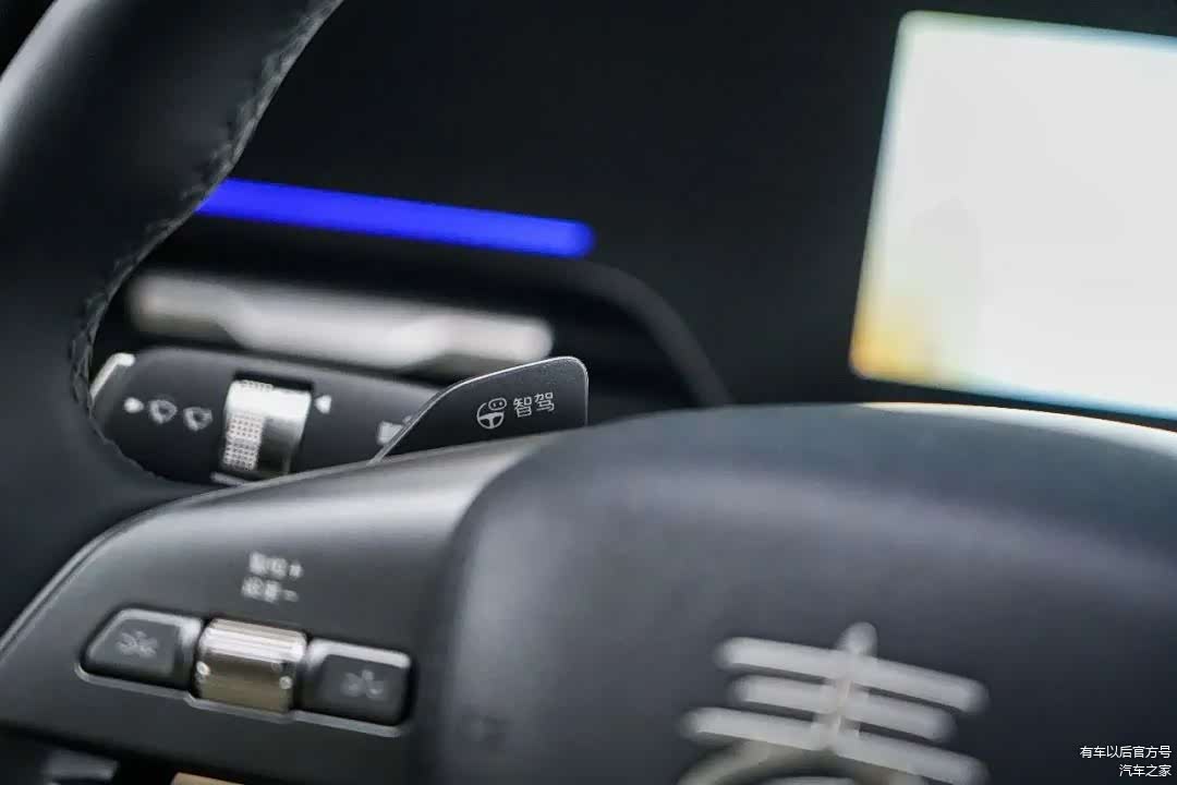 方向盘左侧带有“智驾拨片”,可一键激活“天神之眼C”系统,该系统支持高快路段领航辅助驾驶、城区记忆路线领航辅助驾驶及智能泊车等功能,但仍需一段时间才能推送上车。