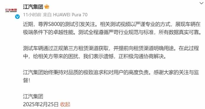 在车主发声之后,江汽集团也做出了回复。江汽表示对比用的迈巴赫确实是租的,并且测试时是严谨和严苛的。迈巴赫是通过正规第三方租赁渠道获取,并且已经向租赁渠道明确用途。对于此次事件,江汽表示遗憾,并表示正在积极解决。