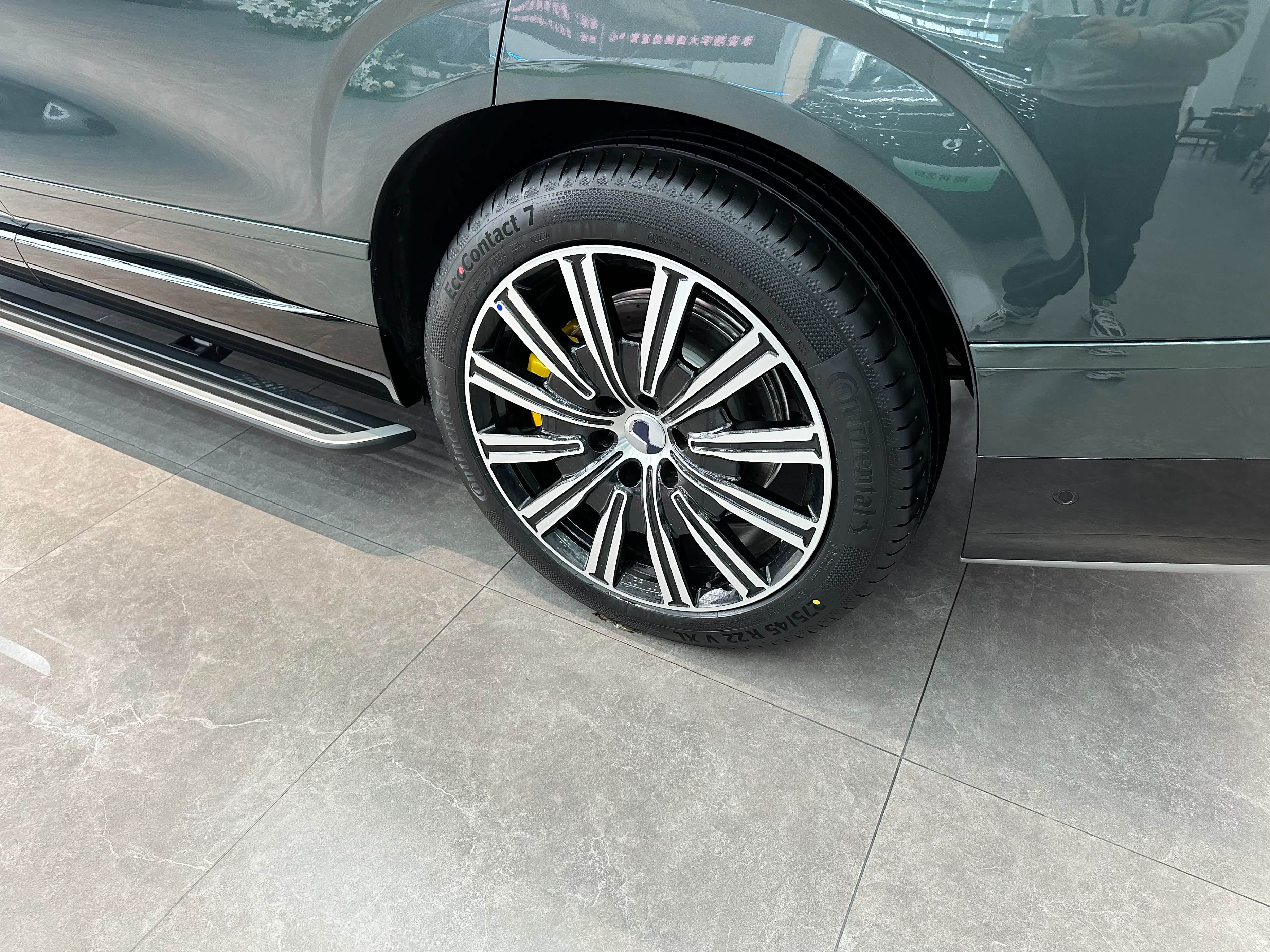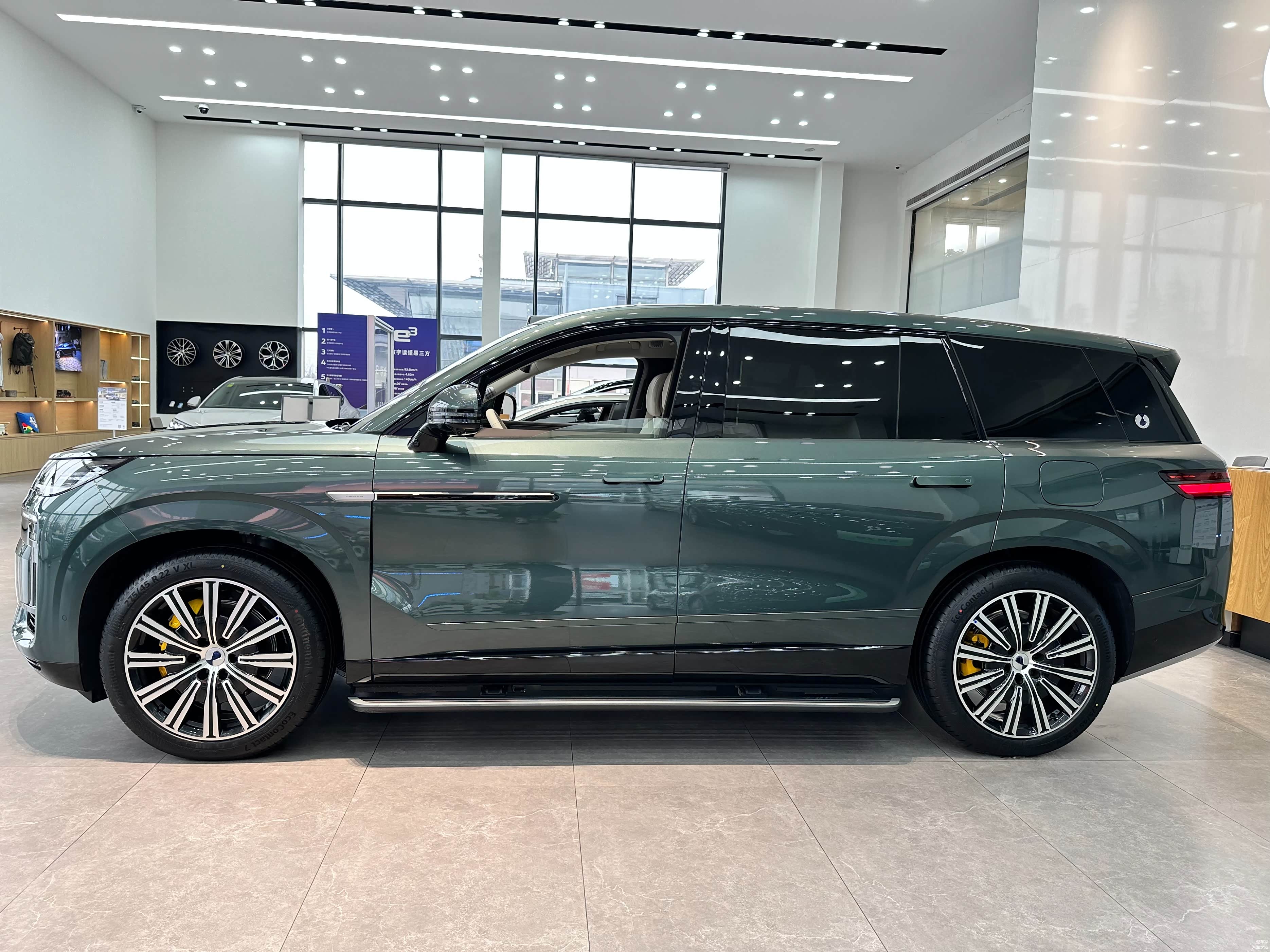一进店,腾势N9庞大的车身便映入眼帘,整车气场十足。它的前脸采用了封闭式格栅设计,中央的腾势LOGO格外醒目,搭配犀利的分体式大灯组,科技感满满。车身侧面线条流畅,5.3米的超长车身和3125mm的轴距,比路虎揽胜、理想L9和问界M9还要大上一圈,搭配22寸的大轮毂以及黄色六活塞卡钳,不仅运动感十足,还提供了强大的制动力,保障行车安全。车尾部分,贯穿式的尾灯设计在点亮后极具辨识度。
