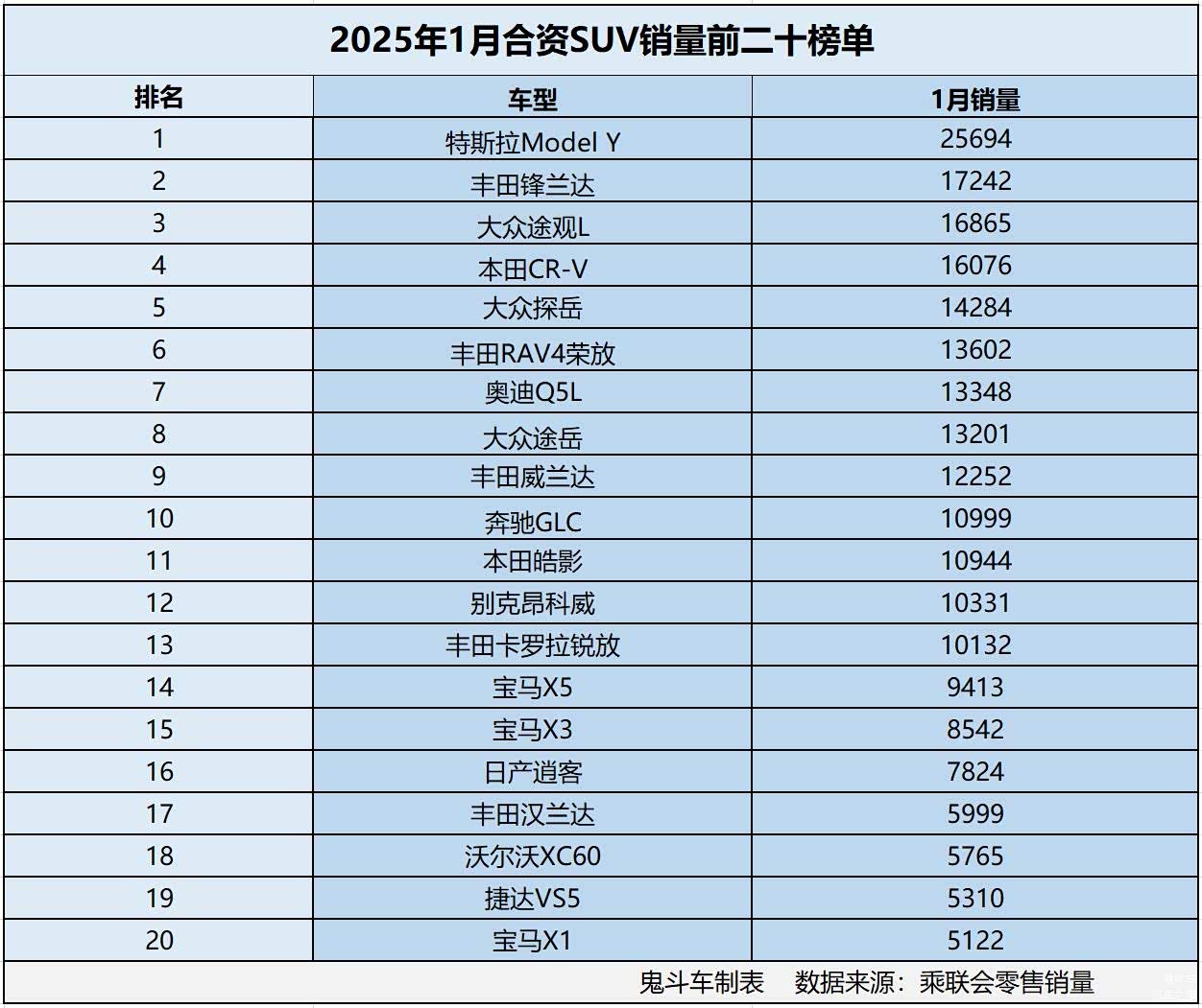 别不信,销量数据是最好的证明。日前,乘联会发布1月零售销量数据,鬼哥整理出合资SUV销量排名前二十的榜单,接下来,看看哪些合资SUV车型榜上有名?