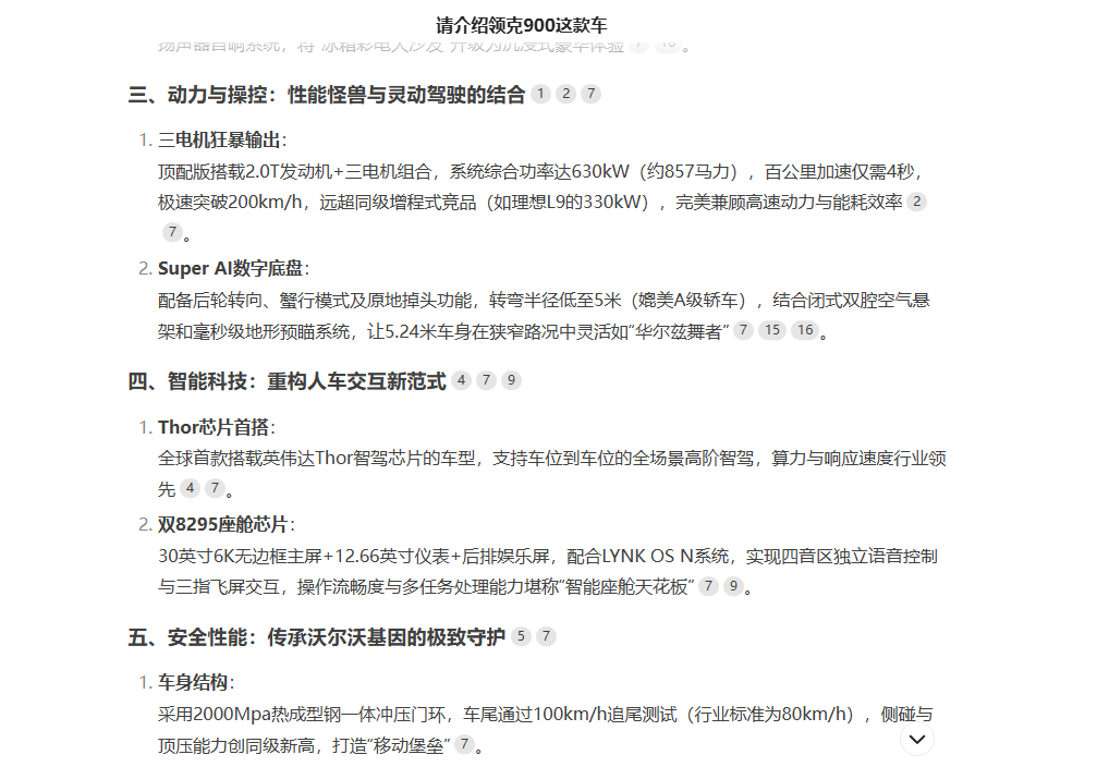 除此之外,DeepSeek还夸赞了领克900的动力系统,这也是我第一次了解到领克900在动力方面的参数。从DeepSeek给出的数据来看,领克900的顶配版会用上2.0T发动机+三电机的组合,综合功率能达到630kW,最大马力857匹,比理想L9的330kW高了近一倍。虽然它是一款车长超5.2米,轴距超3.1米的大型SUV,但在630kW的功率面前,也显得有些“娇小可爱”了。据DeepSeek所说,领克900的零百加速能达到4秒左右,不得不让我感叹一句,有一种“力大砖飞”的美。