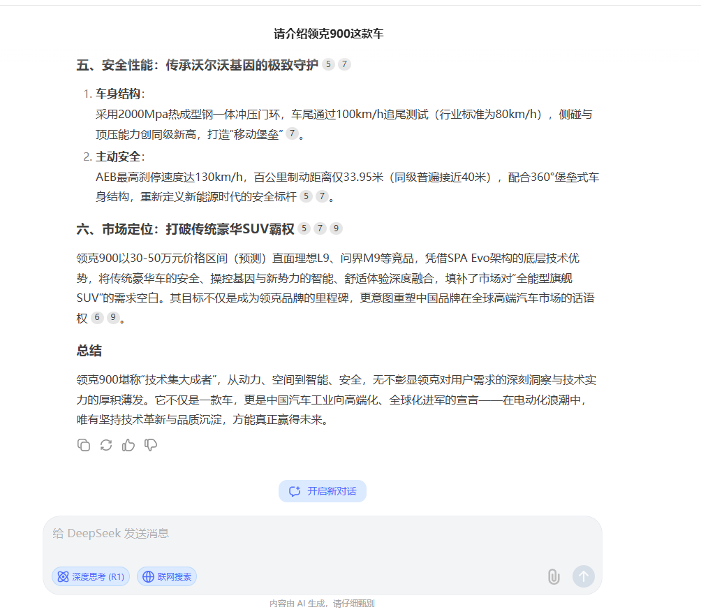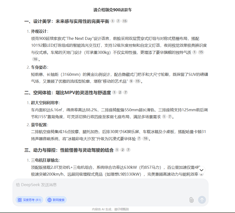 要问近期热度最高的AI工具,DeepSeek说第二,恐怕没有别的工具敢说第一,甚至就连它的服务器,都被一阵阵“浪潮”给用崩了。最近,每当我遇到问题时,都会问问DeepSeek,看看它有什么思路。这不,领克和极氪合并后的首款新车——领克900,终于亮相了。作为车迷,我让DeepSeek对这款车进行了深度评价,看看AI对这款车到底有着什么样的看法。