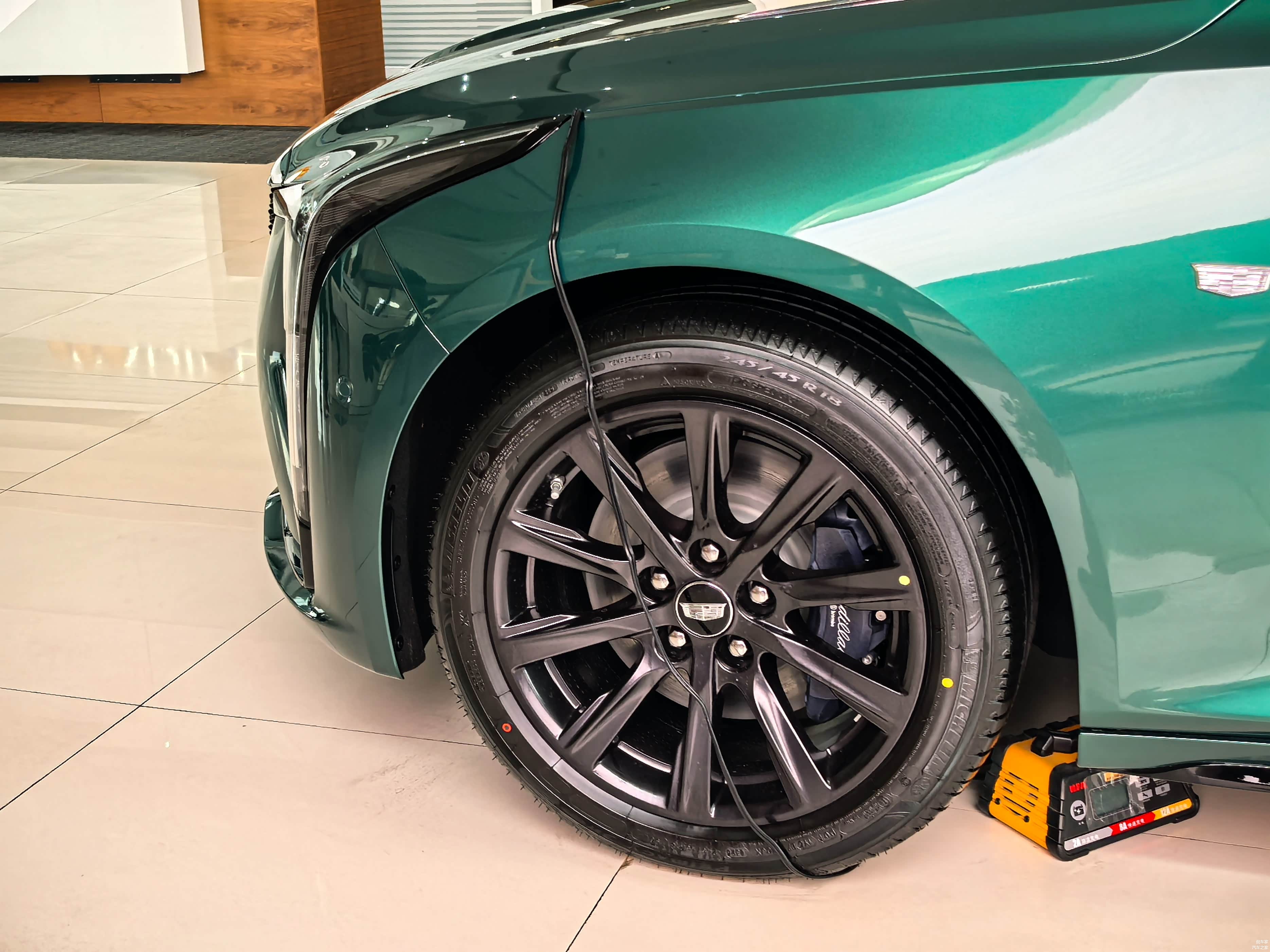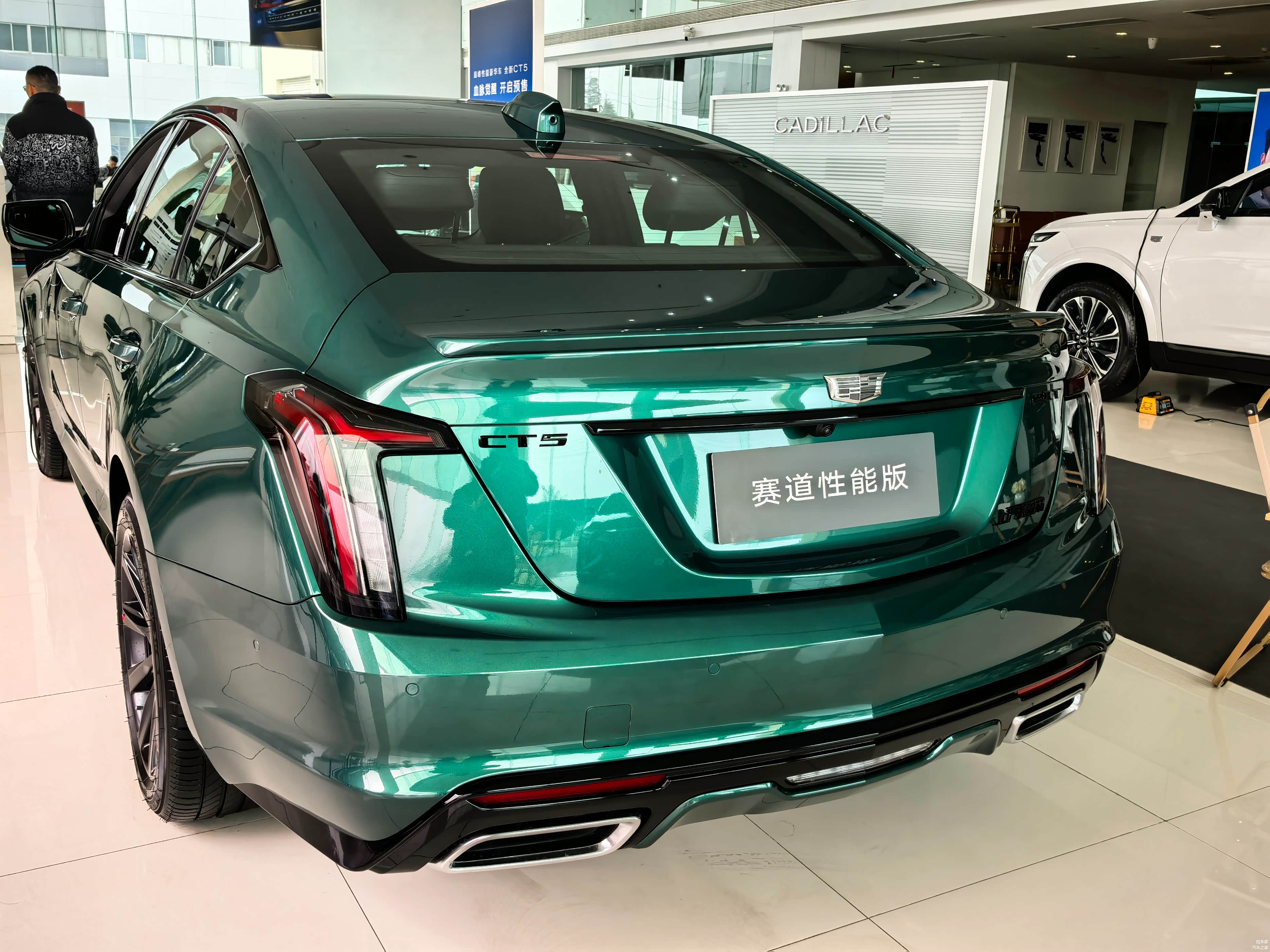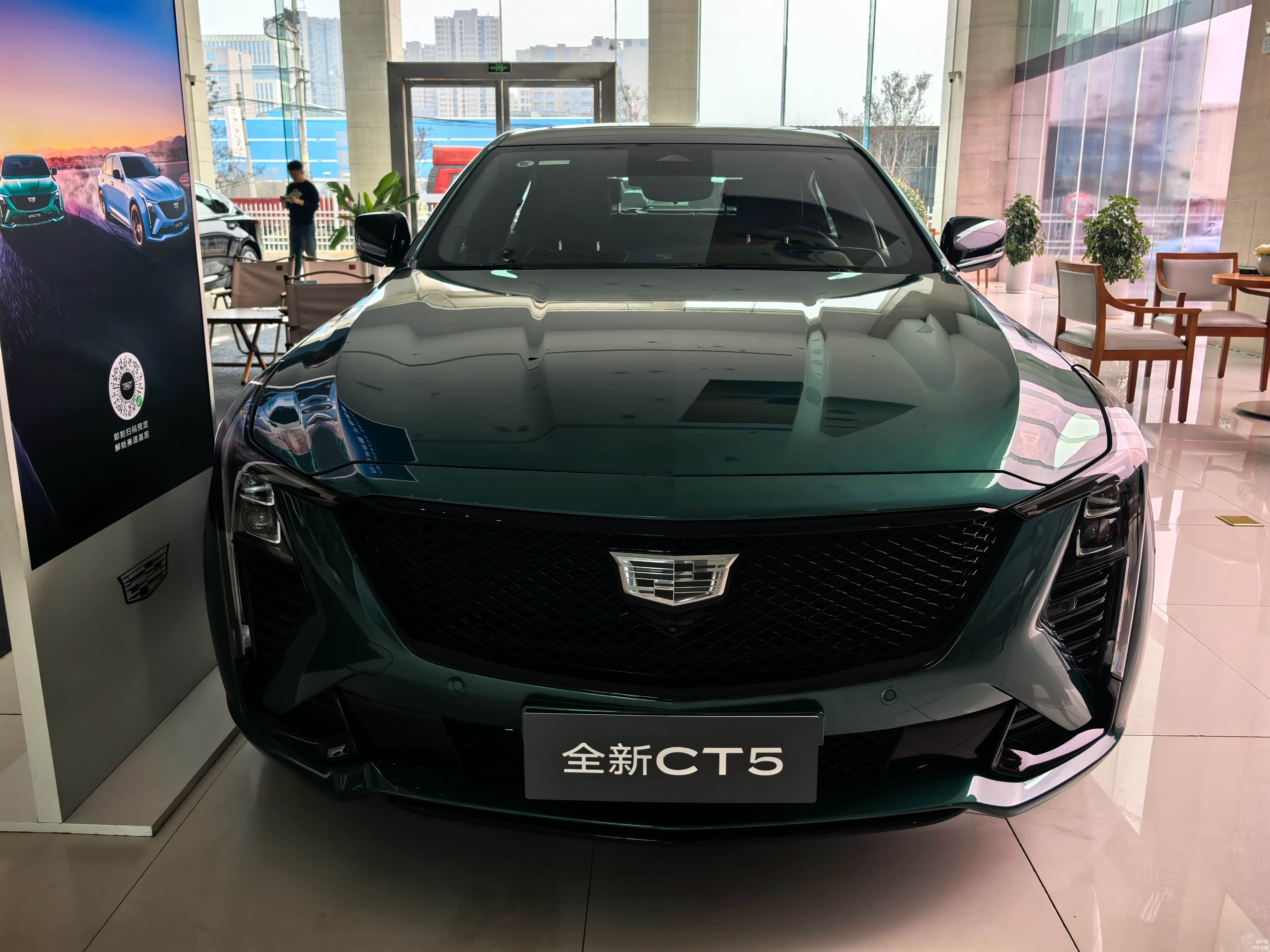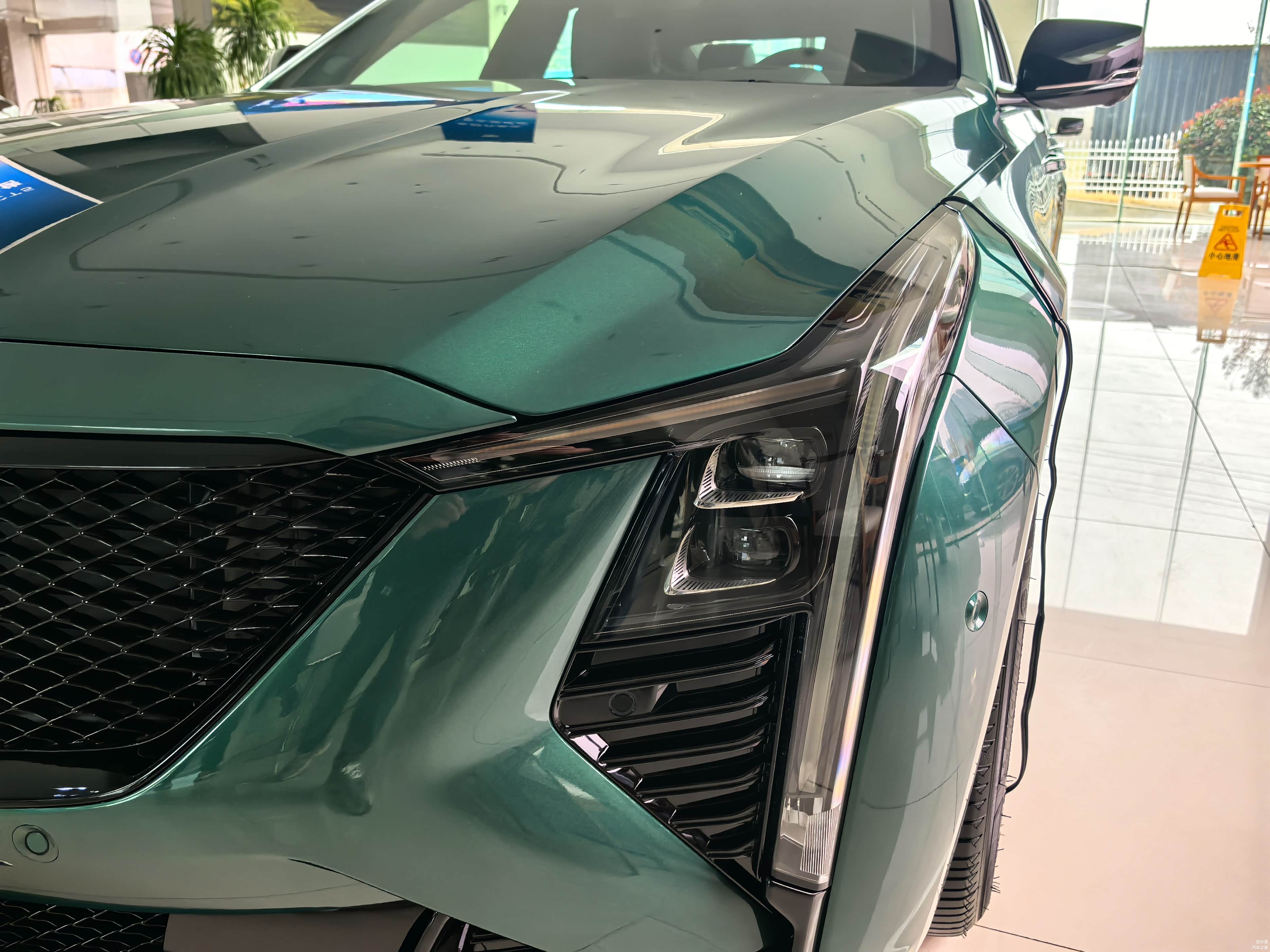 一进4S店,就看到了全新CT5,这次新增的台风绿配色格外吸睛,在展厅灯光的照耀下,车漆显得更加有质感,整体配色尽显凶悍的性能范儿又不失豪华感,说实话,实车比照片还要惊艳。全新CT5依旧采用了标志性的钻石切割设计,车身线条刚劲有力,勾勒出流畅且极具运动感的车身轮廓。凯迪拉克标志性的盾形格栅采用了熏黑处理,搭配全新的灰色LOGO,更添一份高级感。两侧不规则的“泪痕”大灯,造型犀利,点亮后科技感满满,仿佛在诉说着它的独特身份。发动机盖上隆起的四根肌肉线条,仿佛在诉说着它内心的澎湃动力,搭配大溜背造型,轿跑风范十足。