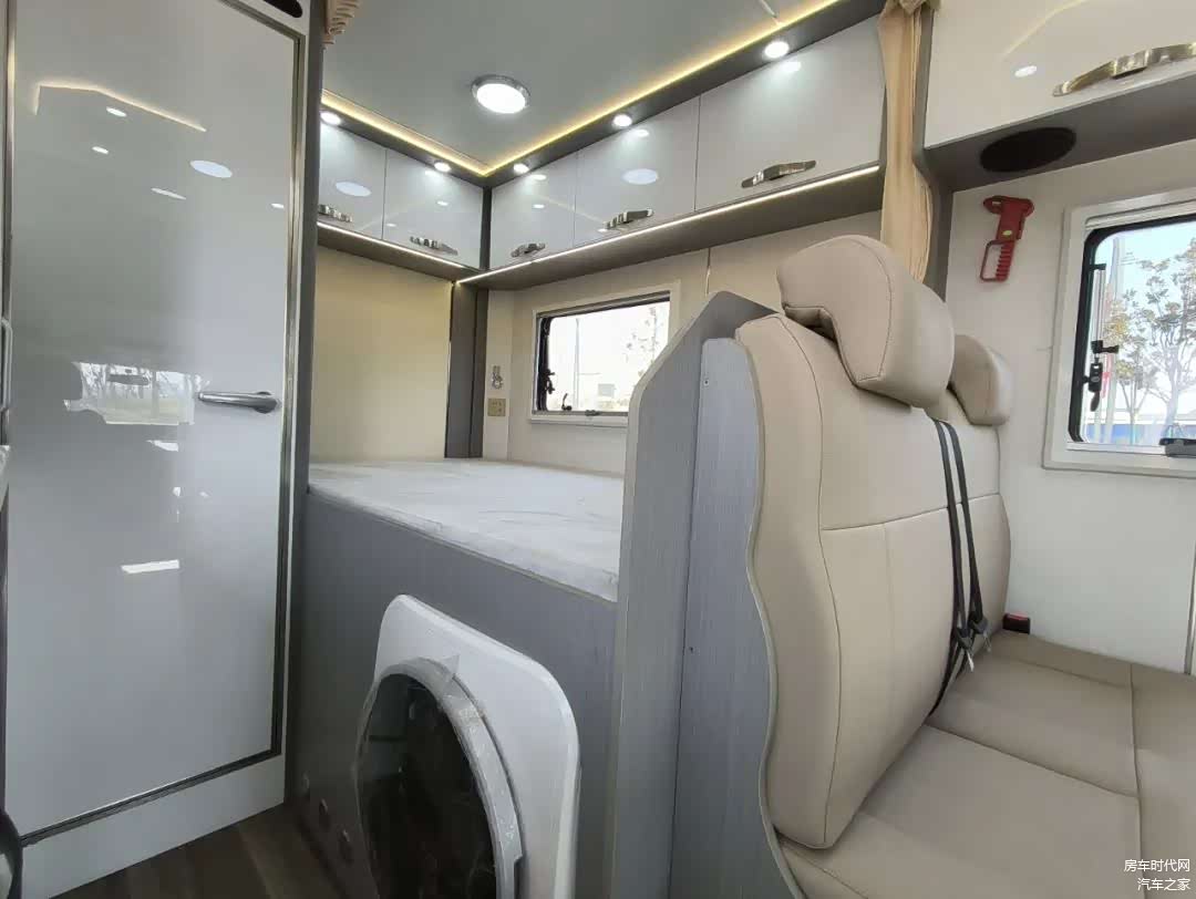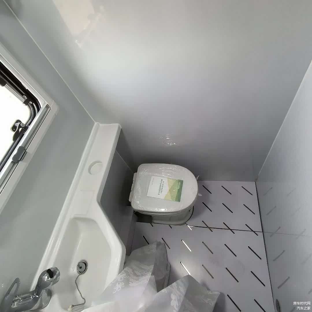 卫生间部分采用不锈钢地池+防滑地板的设计,内部配备了卫生间洗脸盆、抽拉水龙头淋浴花酒套件、浴室镜、置物架、花洒支架等。在卫生间门外的床铺下方有一台房车专用洗衣机带烘干 3.5kg。卫生间马桶采用电动粉碎马桶。