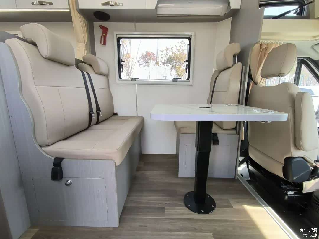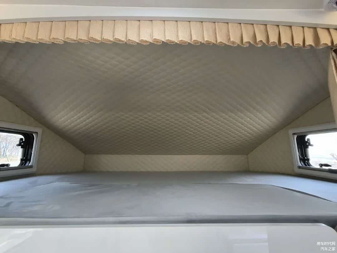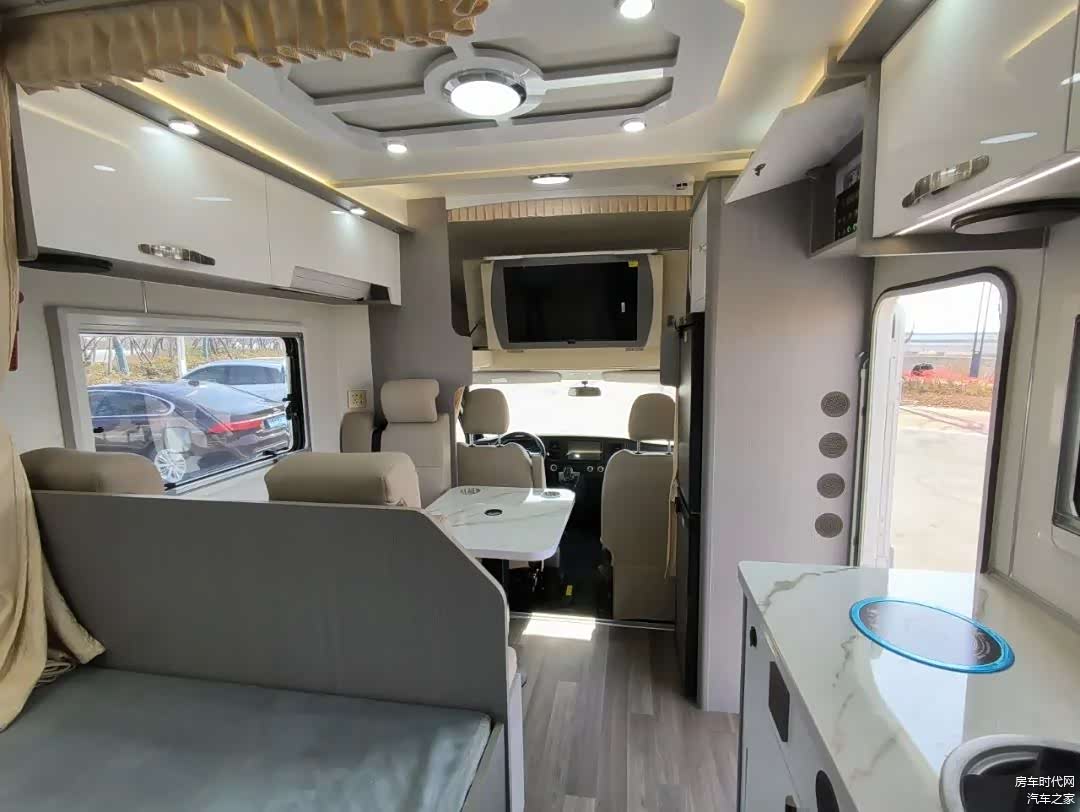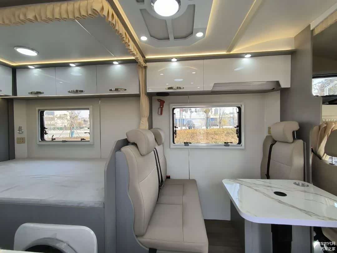 生活区的设计上同样奉行了简单简洁的设计风格,车内的顶部做了软包设计,地板采用高档防滑耐磨方块地板革,车内全车采用了保温隔热处理。布局上与普通C型房车布局一致。