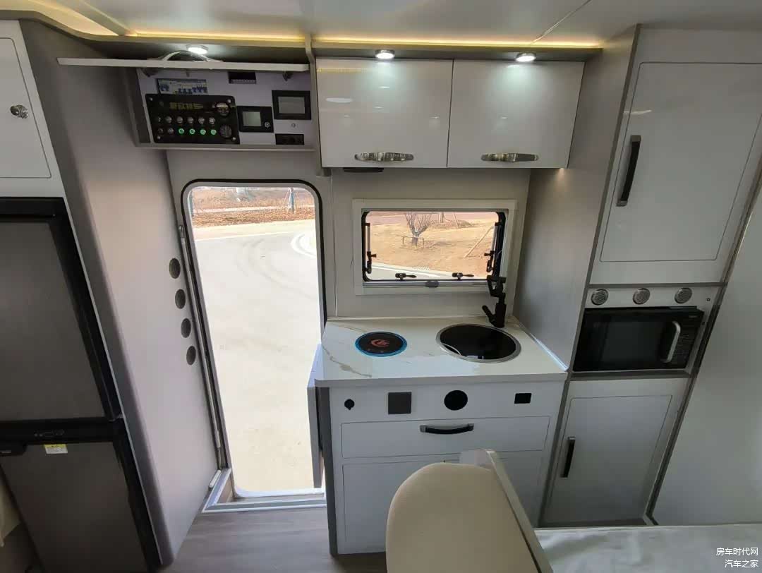厨房区域配备有厨房吧台总成,台面上有电磁炉与带盖洗菜池,侧面设计了微波炉与房车专用冰箱英特尔双冰箱 152L。车内配有一氧化碳 CO 及烟雾报警器。厨房的顶部、下方以及侧边设计有丰富的储物空间。