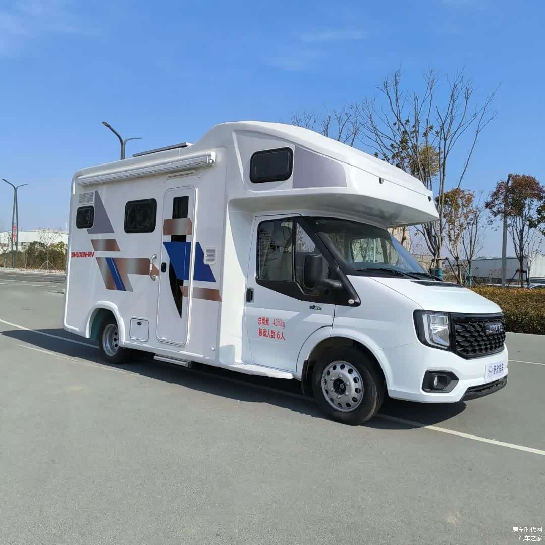 整车基于江铃福顺底盘打造,搭载2.0T柴油发动机,匹配8AT自动变速箱,峰值扭矩400牛米,最大功率107千瓦,油箱容积130L,最高设计时速160km/h。整体外观上采用大面积白色的主基调,额头、厢体部分相对应的做了少部分色块拉花点缀,没有做更多花哨的造型,整体保持了干净简单实用的设计方案。车辆外部尺寸为5995×2410×2920mm,整备质量3800kg,重质量4250kg,轴距3750mm,车内高度达到1950mm,应该是绝大多数普通人在车内都不会感到压抑。车辆外部设计有比较常规的房车专用遮阳棚、室外照明灯、外置不锈钢燃气抽拉灶等,车尾有折叠登顶爬梯。