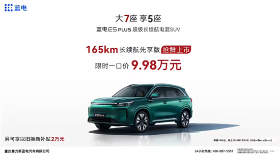 3月1日,蓝电E5 PLUS165km长续航先享版车型上市,限时一口价9.98万元。新车拥有5座版与7座版两种空间布局,同时还将搭载HUAWEI HiCar 4.0智能科技座舱。