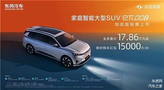 3月1日,东风奕派eπ008如奕版正式上市,新车推出8款车型,售价区间17.86-19.86万元,限时售价(2025年3月1日至3月31日)16.36万元起。此外,在此期间购车可享受1.5万元的购车红包优惠。