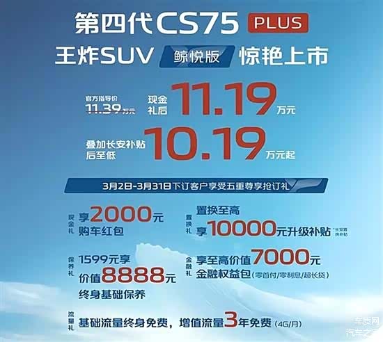 3月1日,第四代长安CS75PLUS鲸悦版正式上市,新车共推出1款车型,官方售价为11.39万元,现金礼后11.19万元(限时3月31日前),现金礼叠加补贴后售价10.19万元。同时,官方还推出置换礼、保养礼等五大购车权益。