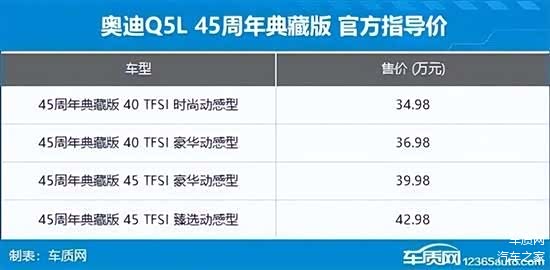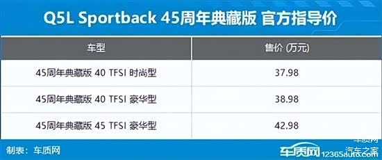 2月28日,车质网从奥迪官方了解到,奥迪Q5L和奥迪Q5 L Sportback 45周年典藏版车型正式上市。其中,前者推出4款车型,售价区间34.98-42.98万元,后者推出3款车型,售价区间37.98-42.98万元。