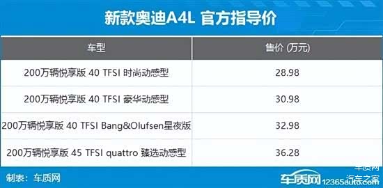 2月27日,奥迪A4L悦享版正式上市,新车推出4款车型,售价区间28.98-36.28万元。作为年代改款车型,新车增加了部分配置,并且入门价格下调3.2万元。