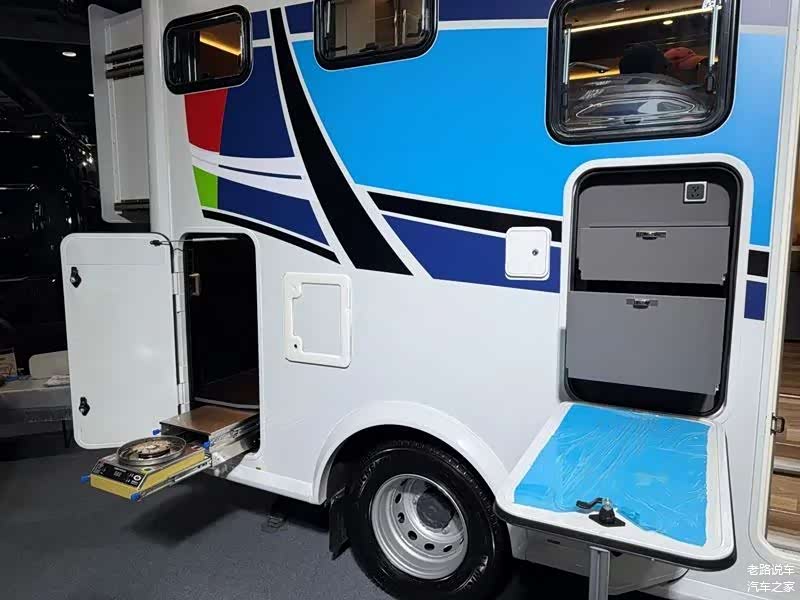 打开车身右侧的盖板可以看到储物箱和抽拉式柴油灶,此外车身右侧还带有可以折叠的遮阳棚和照明灯。