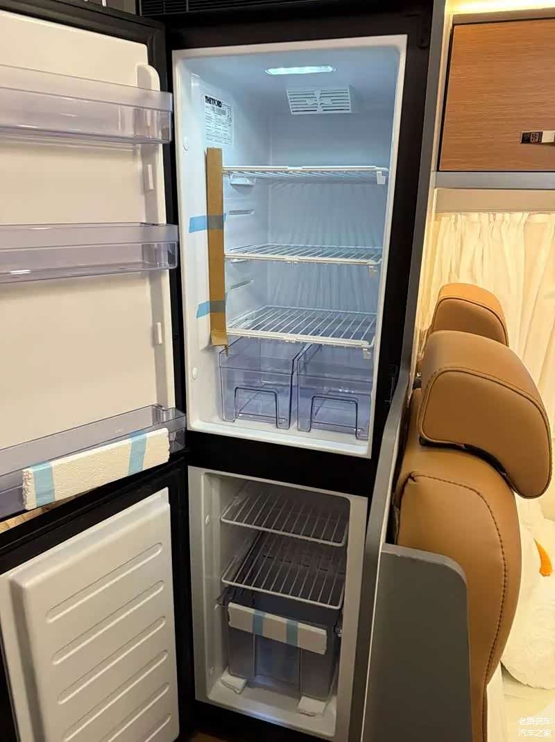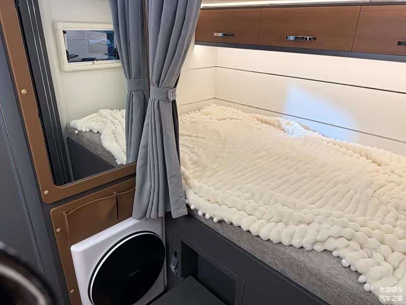 车内后部双人床尺寸达到2180×1200mm,旁边还有镜子和美的3kg全自动洗衣机。