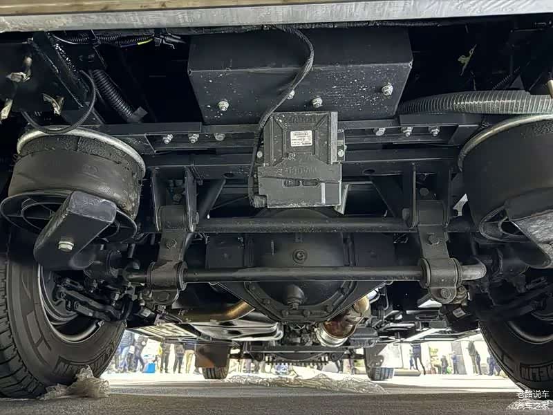 依维柯原厂空气悬挂,可自动调平。空气悬挂的应用不仅有助于提升车辆舒适性,也有利于降低自重。在底盘后部还设有支腿,进一步保障停车时候的安全和平稳。