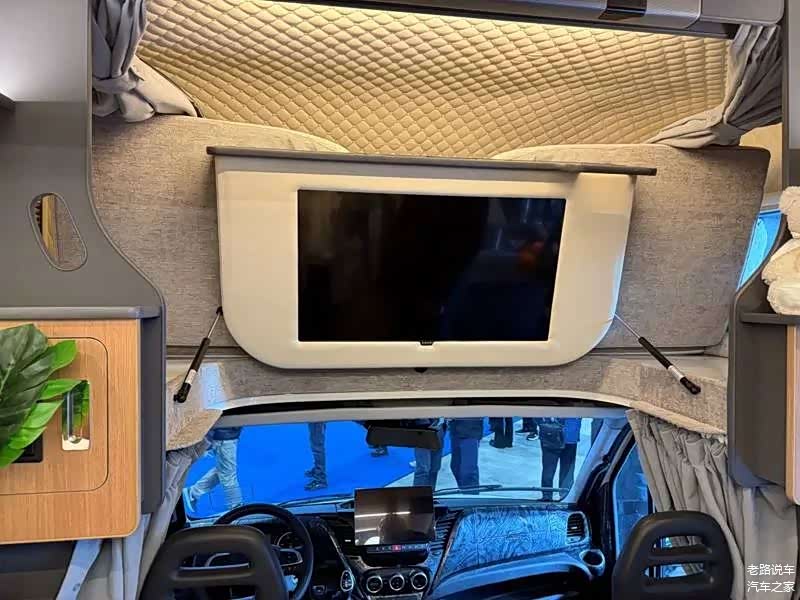驾驶区与生活区连通设计,方便进出。车顶前部双人床尺寸为2180×1350mm,床铺向上翻起是小米32寸智能电视。