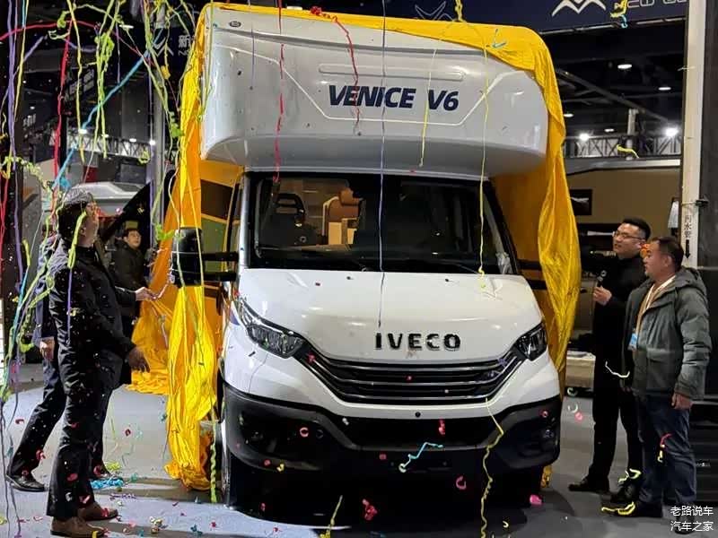 新车揭幕,彩带飞舞。图片上这辆白色的房车就是使用进口依维柯NEW DAILY 65C180H底盘的威尼斯V6房车,底盘由依维柯股份有限公司苏扎拉工厂生产,车身由戴德房车制造,属于依维柯专为中国市场定制的房车。