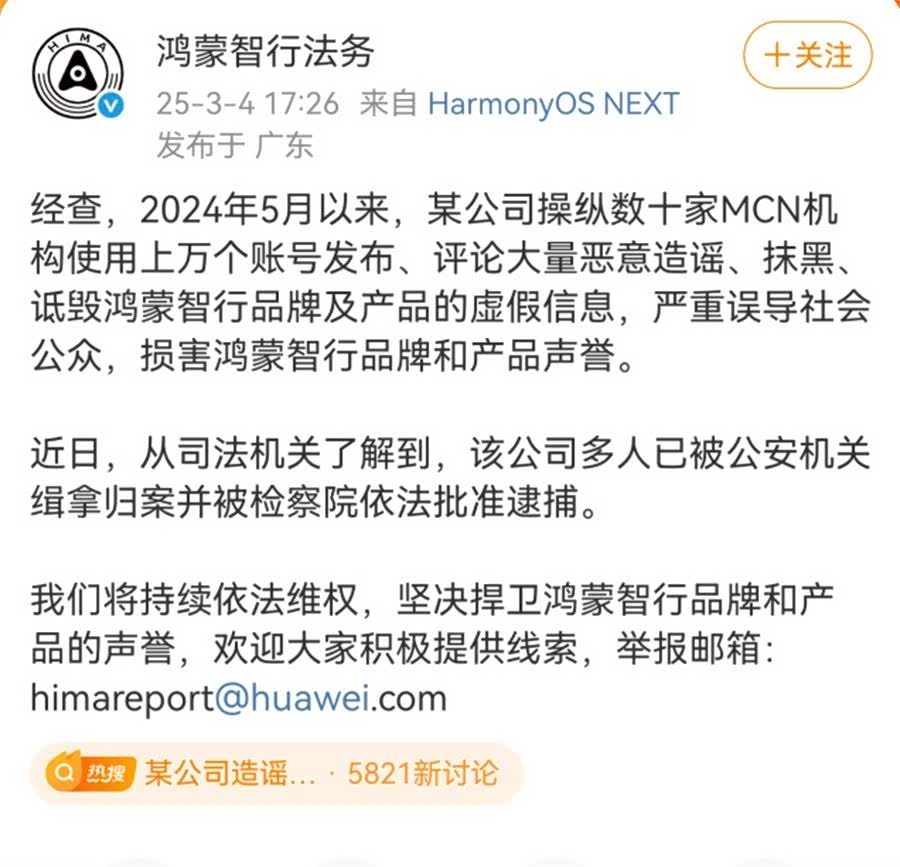 【文/财圈社&道哥说车 张浅】继不久前鸿蒙智行悬赏500万打击黑公关后,3月4日,鸿蒙智行法务上线,其第一条微博就来了个大的。内容称,经查,2024年5月以来,某公司操纵数十家MCN机构使用上万个账号发布、评论大量恶意造谣、抹黑、诋毁鸿蒙智行品牌及产品的虚假信息,严重误导社会公众,损害鸿蒙智行品牌和产品声誉。该账号同时称,从司法机关了解到,该公司多人已被公安机关缉拿归案并被检察院依法批准逮捕。