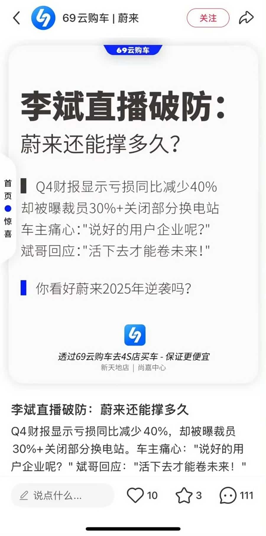 事实上,带节奏故意抹黑的行为在近两年的车市中十分常见。有意思的是,就在鸿蒙智行“打黑”的同一天的18:15分,69云购车账号抢跑了蔚来的黑稿,网传内容:Q4财报显示亏损同比减少40%,却被曝裁员30%+关闭部分换电站。车主痛心:“说好的用户企业呢?”斌哥回应:“活下去才能卷未来!”