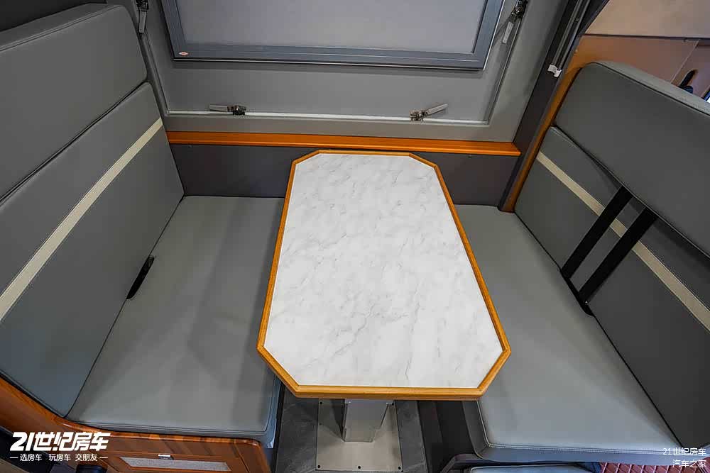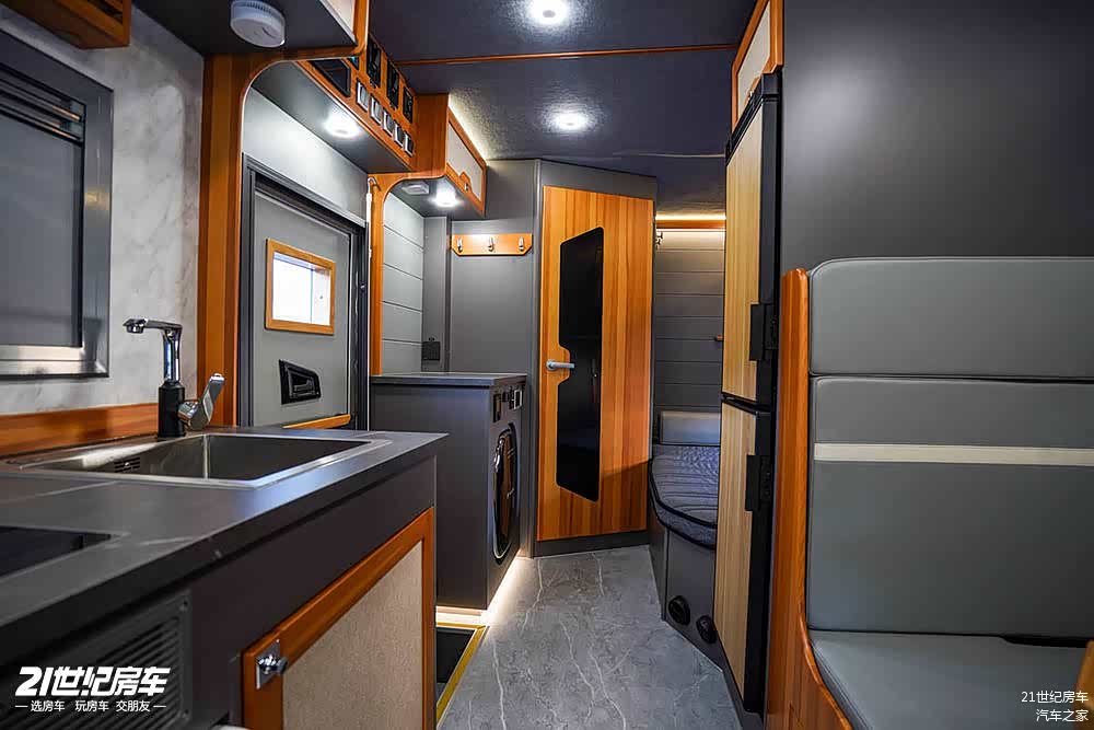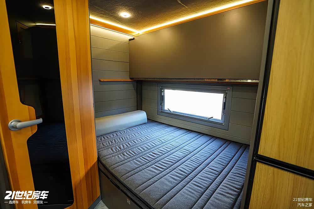 走进车内,内饰给人一种高品质的感觉。车内采用了房车专用轻质板材搭配进口樟子松实木家具,地面选用进口岩板,顶棚则是灰色房车专用毛毡布,内墙进行了皮革软包,从装饰材料到细节工艺,都彰显着豪华与舒适,为车内营造出温馨且高档的居住氛围。