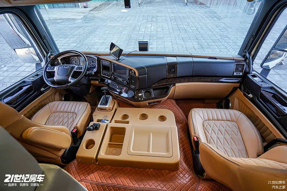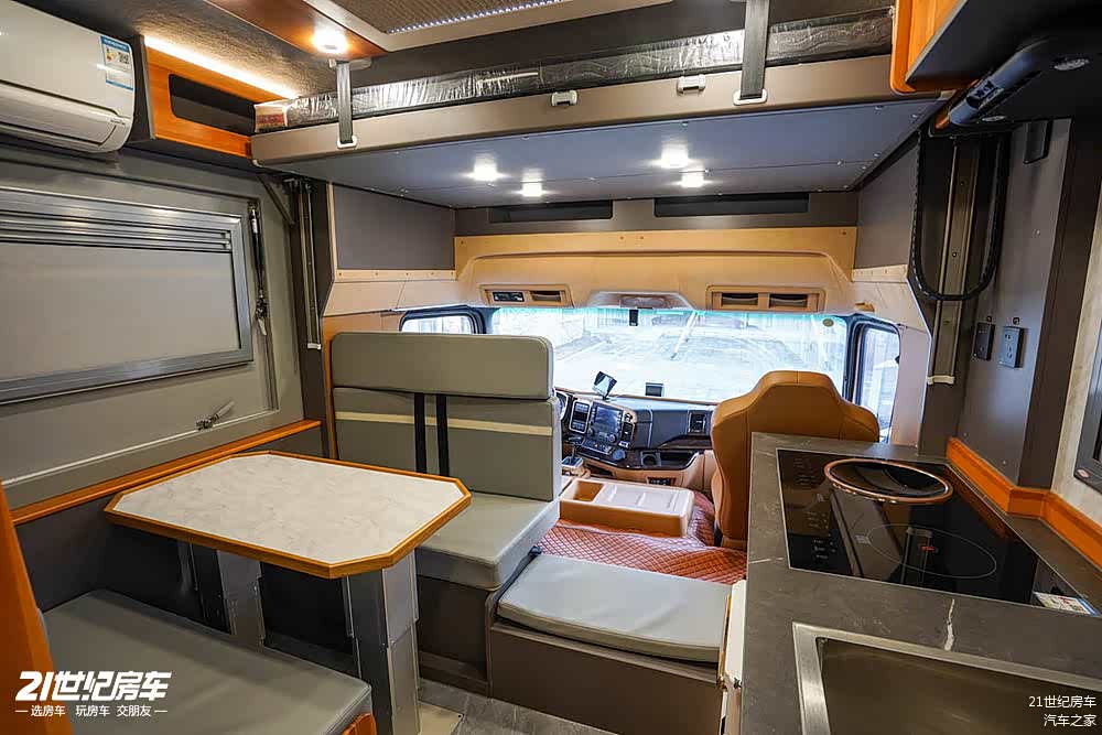 与以往轻卡、重卡房车非常不同的采用大通舱的空间设计,在后方乘坐的乘客视野更加开阔,驾驶室上方还增加了一张电动升降床,前方还设有两个储物格。