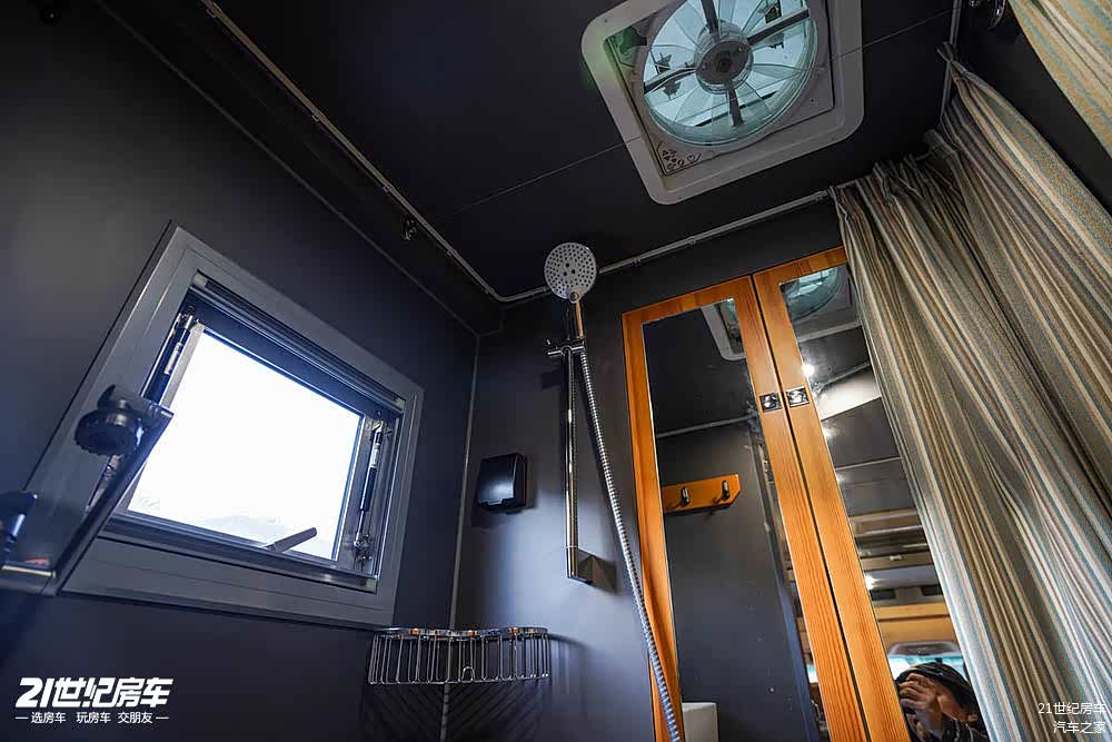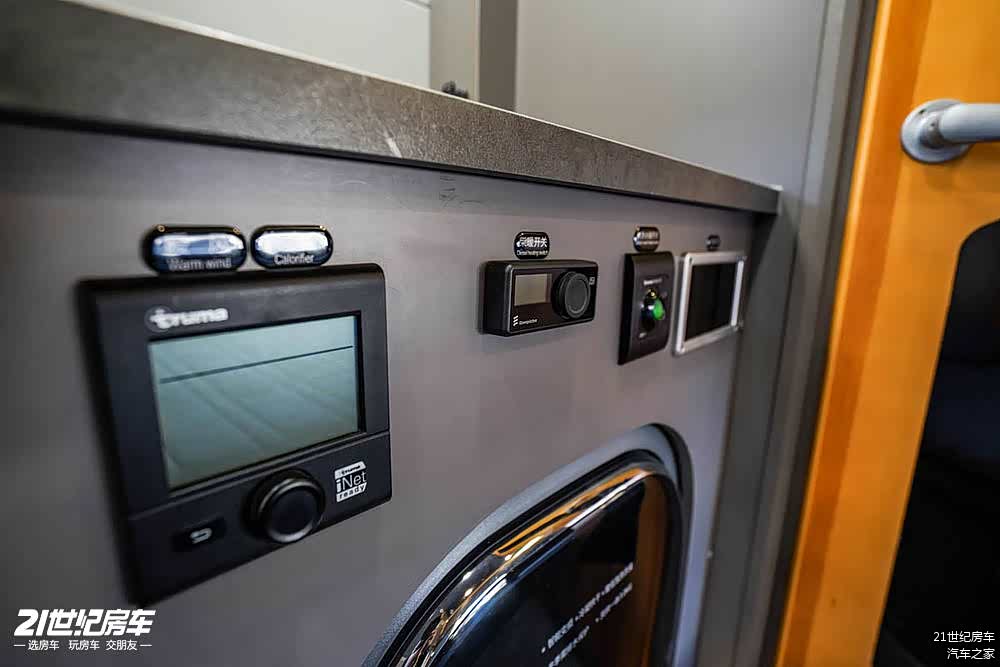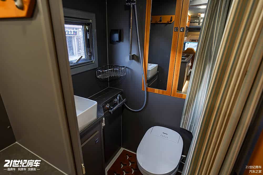 另一侧配备莫博3KG洗烘一体洗衣机,后方卫生间配备房车专用坐便(带冲洗电加热)、洗手盆、汉斯格雅恒温花洒、毛巾杆、卫浴镜、Max雨感换气扇,也有部分的储物空间。
