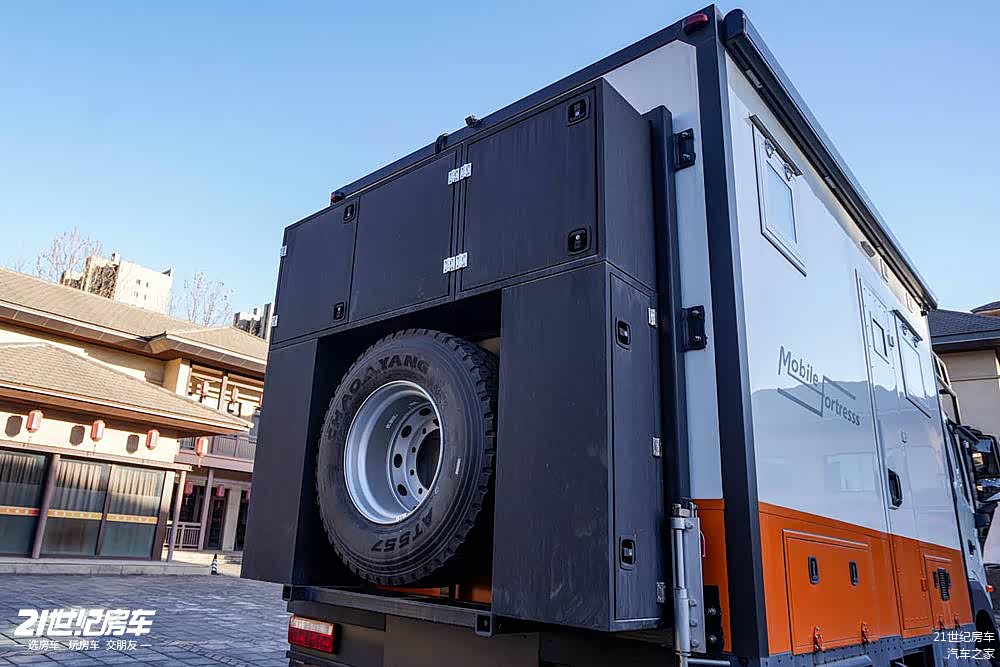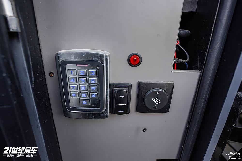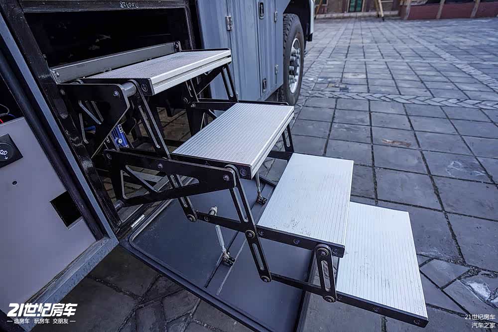 车身右侧,配备了4米电动遮阳篷,后厢舱门使用越野专用舱门,配备密码锁、电动上车踏步。